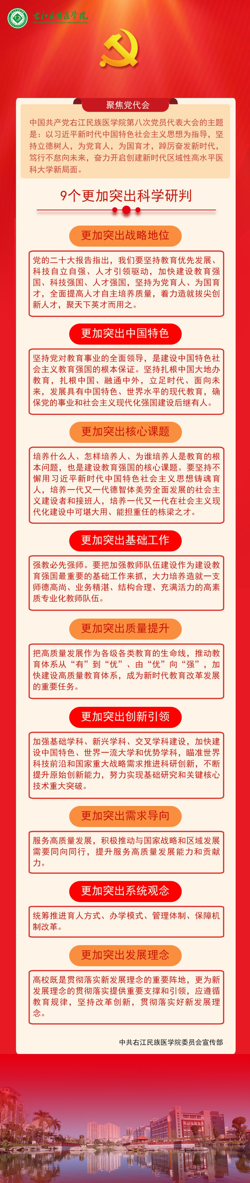 学校第八次党代会报告指出,要紧紧围绕党和国家战略目标和举措,主动超前布局、有力应对变局、奋力开拓新局,加快推进教育现代化,以教育之力厚植人民幸福之本,以教育之强夯实国家富强之基,为全面推进中华民族伟大复兴、为建设新时代中国特色社会主义壮美广西贡献右医力量。具体体现在: