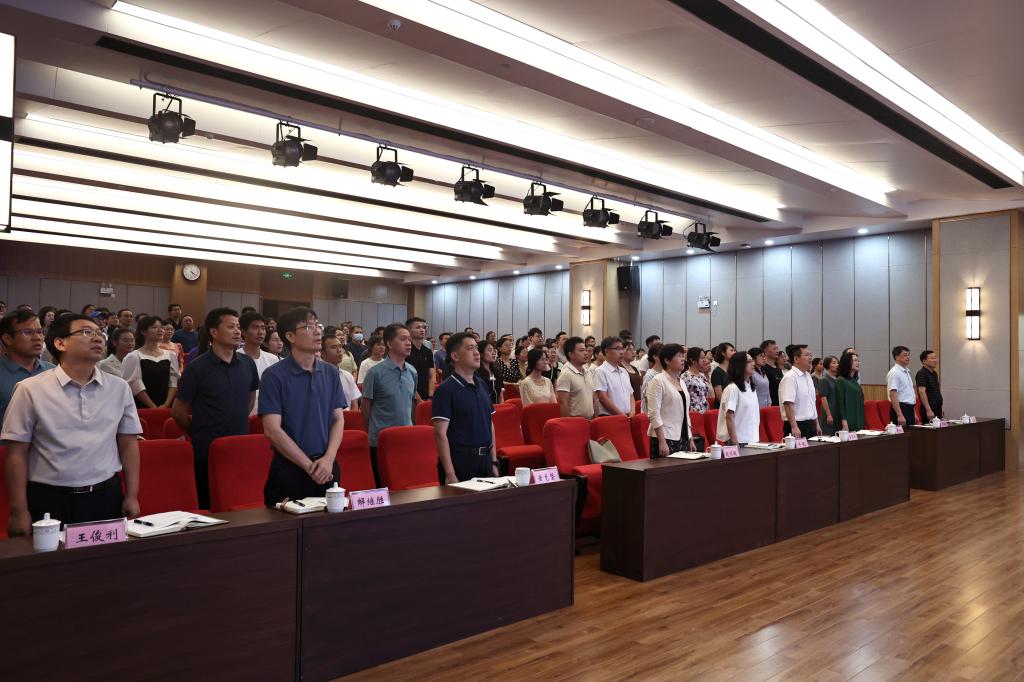 7月13日,开云官网举行师德集中学习启动会暨新时代文明实践所“师德讲堂”教育活动。图为与会人员共唱校歌《大医精诚》。