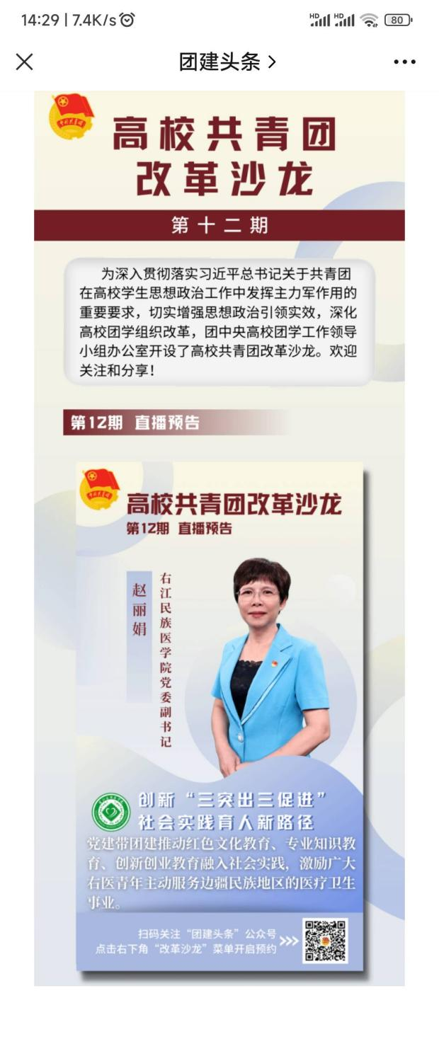 2023年8月23日下午,开云官网党委副书记赵丽娟在共青团改革沙龙平台上分享学校共青团改革经验,全国团干和青年学生们通过“团建头条”公众号观看直播。