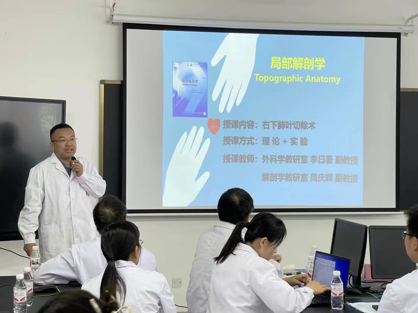 本次活动中,临床医学院(附属医院)李传玉副主任医师、陈永诚副主任医师、李日著副主任医师、李文川副主任医师、郭俊宇副主任医师和梁月秀副主任医师6位专家结合《局部解剖学》知识对“颞区硬膜外血肿清除术”“甲状腺次全切除术”和“胆囊切除术”等6个手术进行了详细讲解并在“大体老师”上进行了模拟。活动现场老师们积极互动,就《局部解剖学》教学进行了热烈讨论。
