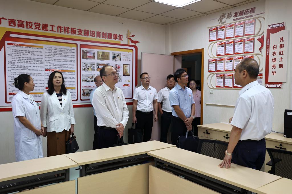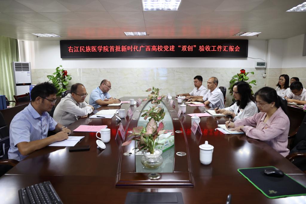 10月9日上午,自治区党委教育工委首批新时代广西高校党建“双创”工作验收第一小组组长、桂林理工大学党委常委、组织部部长唐壮东,南宁师范大学自然资源与测绘学院党委书记、党委组织部副部长黎先,广西工业职业技术学院党委组织部副部长张敏一行3人,对开云官网入选首批新时代广西高校党建“双创”培育创建单位——护理学院党委、机关党委组织统战党支部、医学影像学院学生第一党支部、临床医学院(附属医院)肾内科党支部等“标杆院系”和“样板支部”建设情况进行实地验收。学校党委书记邓砚,党委组织部和各培育创建单位负责同志参加有关工作。