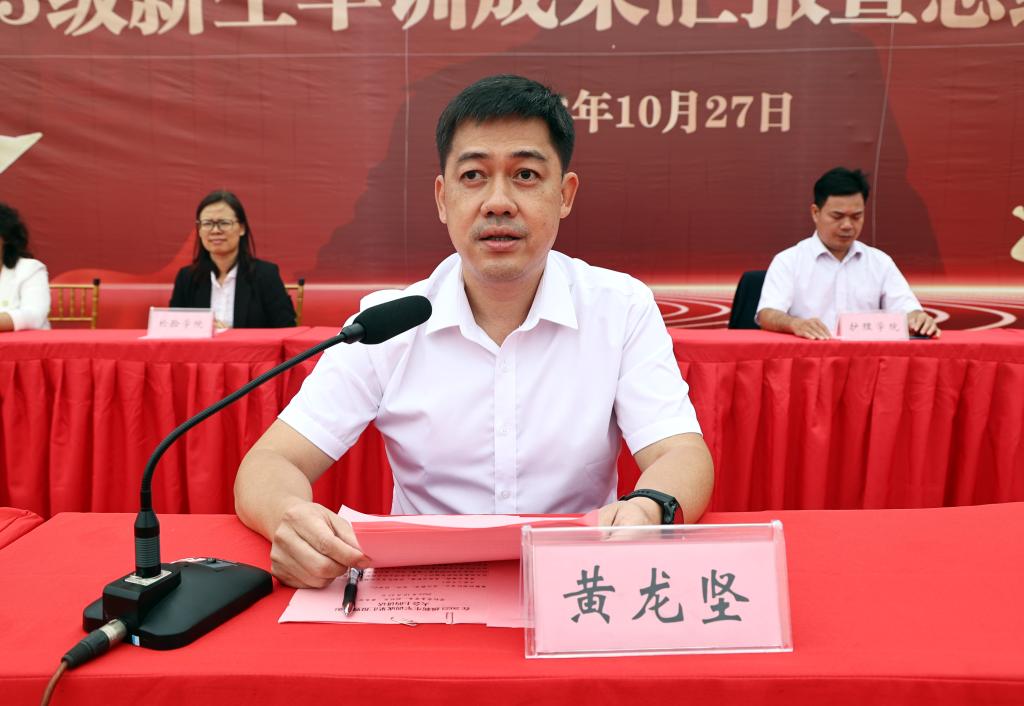 学校党委常委、副校长黄龙坚代表学校党政领导班子向出席大会的武警百色支队领导表示热烈的欢迎,向在军训一线的全体教官表示衷心的感谢,向圆满完成各项军训任务的全体参训同学致以诚挚的问候,向在本次军训中取得优异成绩的先进集体和个人表示热烈的祝贺。黄龙坚副校长向同学们提出三点要求:一要坚定理想信念,厚植家国情怀;二要弘扬军训精神,锤炼品德修为;三要保持勤学奋进,勇于实践创新。他希望同学们能够秉承“大医精诚”校训,弘扬“艰苦创业、自强不息”的右医精神,为实现中华民族伟大复兴中国梦而努力奋斗。