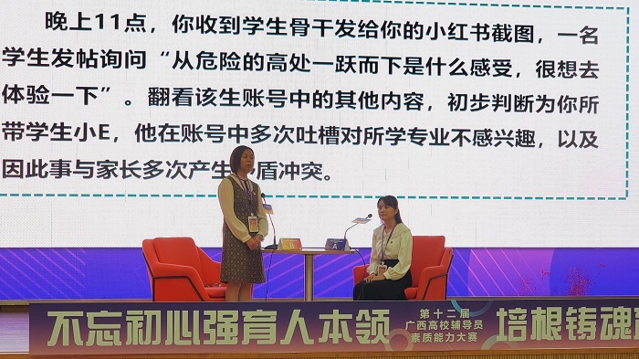 大赛分为基础知识测试、案例研讨、谈心谈话三个环节。全区82所高校,共派出92名选手参赛。开云官网何彦妮老师凭借扎实的理论基础和优秀的专业素养在大赛中脱颖而出,充分展现了开云官网辅导员队伍扎实的理论功底、过硬的业务素质和良好的精神面貌。