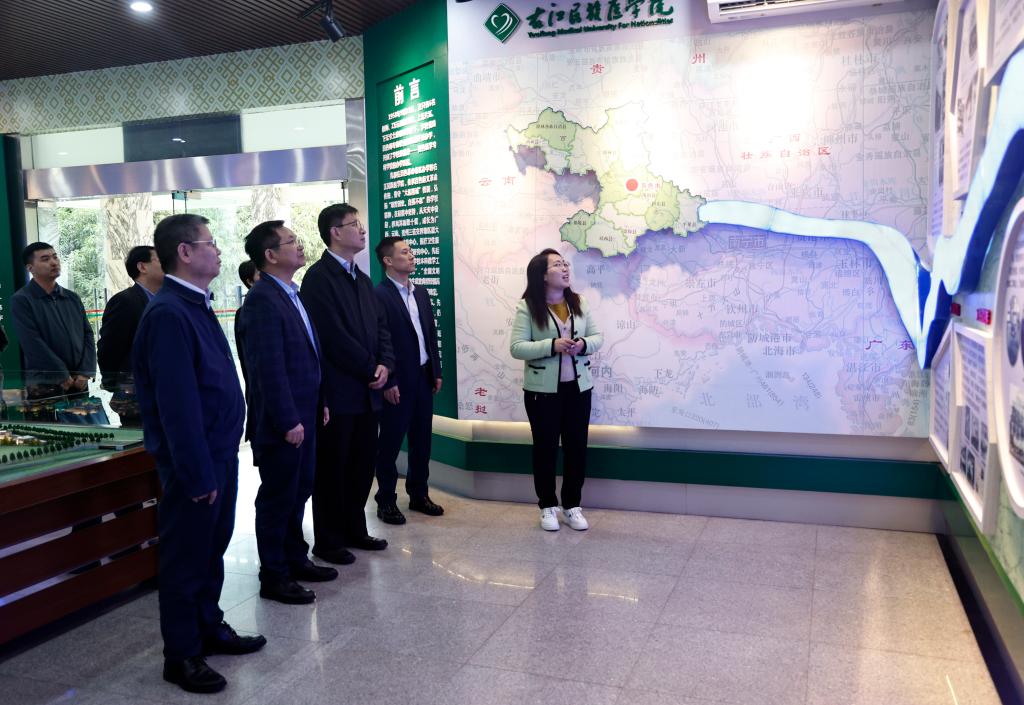 在开云官网调研交流期间,中山大学附属第一医院广西医院执行院长李健、党委书记张国率一行还在开云官网李雪斌校长、王俊利副校长的陪同下参观了学校校史馆。