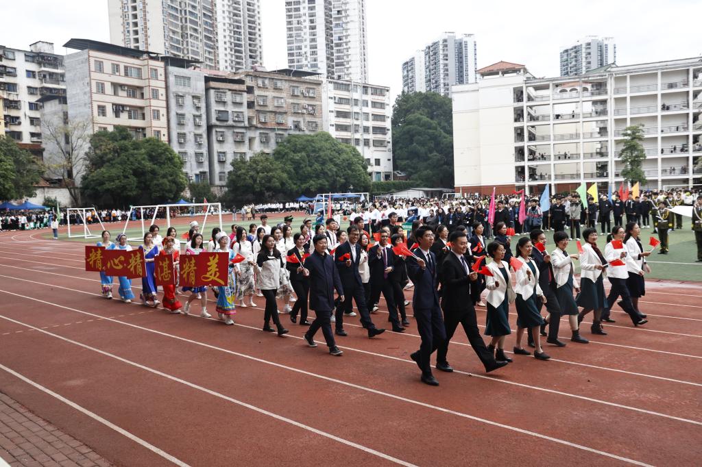 随着暖场歌曲的响起,运动会开幕式正式开始。伴随着《运动员进行曲》,学校国旗队、裁判方块队、学校党政机关方块队以及各二级学院方块队有序进场,他们迈着铿锵有力的步伐,喊着整齐响亮的口号,昂首挺胸走过主席台。