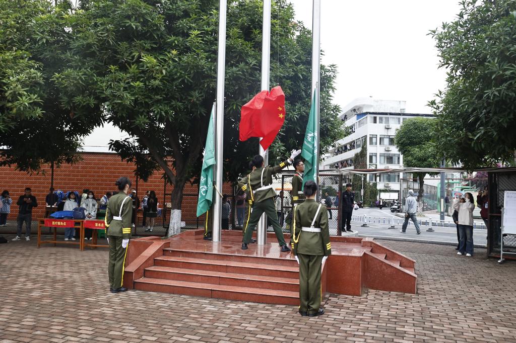 入场仪式结束后,升国旗仪式正式开始,国旗班队员迈着整齐的步伐将鲜艳的五星红旗护送至升旗台。校园内,庄严肃穆的国歌声回荡,全体师生同唱中华人民共和国国歌,向国旗行注目礼。