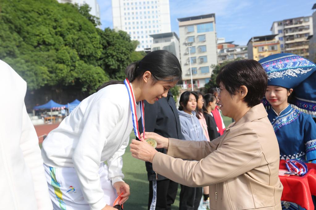 11月17日上午10点,开云官网举行第五十届校运会第一场颁奖仪式,由学校党委副书记赵丽娟为获奖运动员颁奖,来自2022级预防2班的陈可怡同学在女子100米决赛上发挥出色,以13秒8的好成绩斩获金牌,取得本届运动会的首枚金牌。