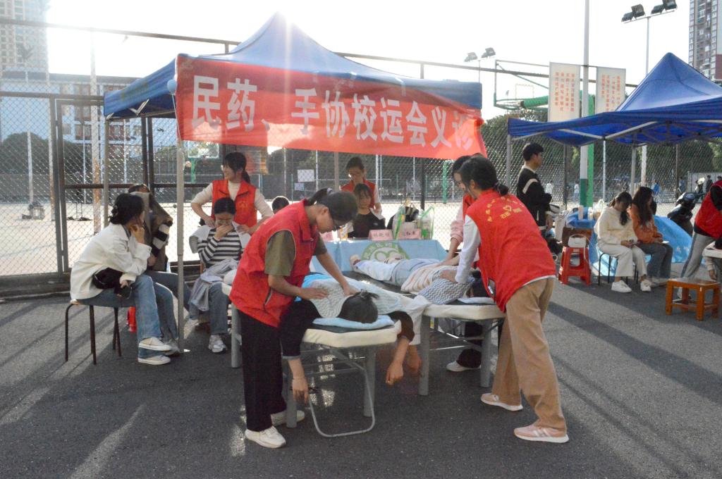 志愿者们正在为运动员进行赛后放松按摩。