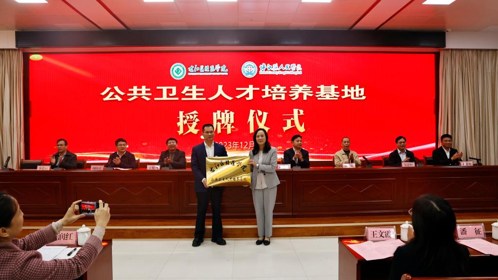 邓砚书记代表学校分别向博白县人民政府、博白县人民医院授予“开云kaiyun登录入口全人群健康促进与卫生政策研究博白中心”“开云kaiyun登录入口教学医院”“开云kaiyun登录入口公共卫生人才培养基地”牌匾。