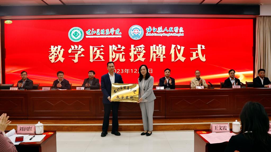 邓砚书记代表学校向博白县人民医院授予“开云kaiyun登录入口教学医院”牌匾。