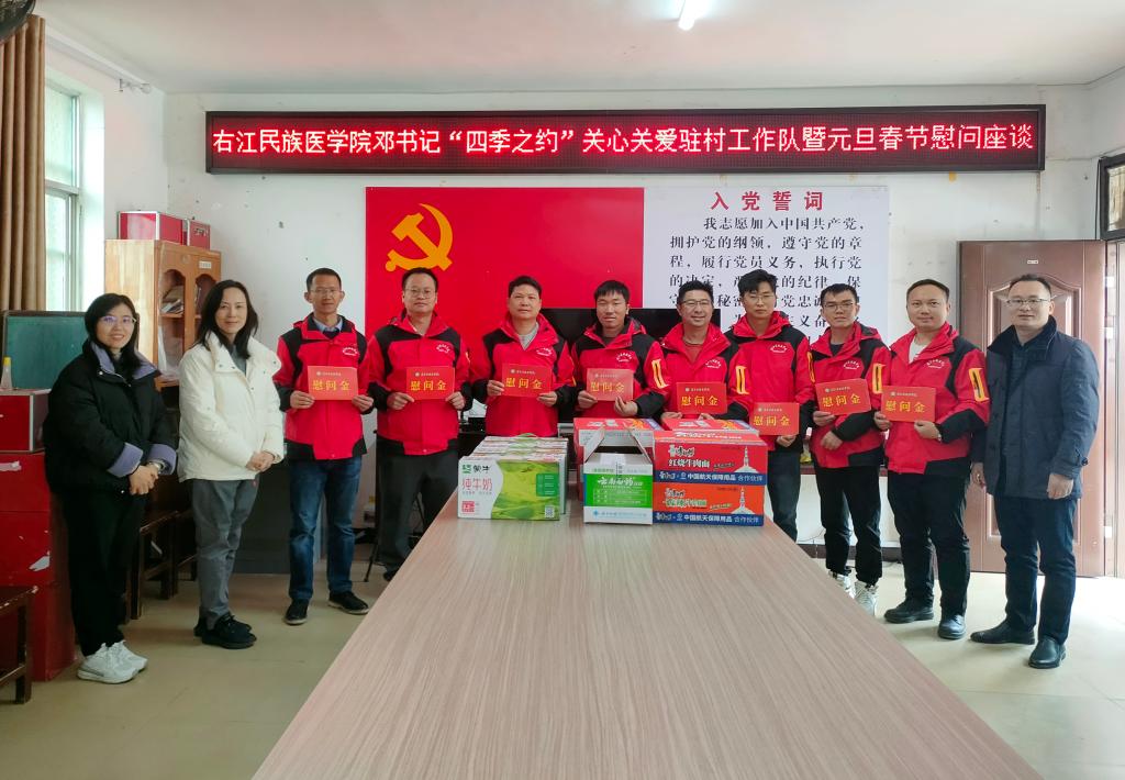 最后,邓书记对驻村工作队提出了三点希望:一是学思践悟,贯彻落实。要学习贯彻落实习近平总书记12月14—15日视察广西时的重要讲话精神,特别是习近平总书记对乡村振兴、铸牢中华民族共同体意识的要求,要从村屯这个最基层的单元抓好落实。二是履职尽责,追求卓越。驻村工作队要正确认识自己的职责,要贯彻落实党的全面领导,以党建“五基三化”提升年行动为抓手做好农村党建工作,做好发展党员工作,发动群众,发挥好党组织的作用,带领村里发展。要发挥好学校在教育、医疗方面的优势,持续用力做好乡村振兴工作。要关注产业发展,提升推动产业发展、乡村治理等方面的能力。三是加强沟通,凝聚合力。要做好与上级党委政府、深圳罗湖区、后援单位、企业、党员群众等多方面沟通,汇聚人才、政策、经费及各类资源,凝聚发展合力,把乡村振兴工作落到实处,坚持在发展中保障和改善民生,不断提升人民群众的幸福感、获得感和满意度。