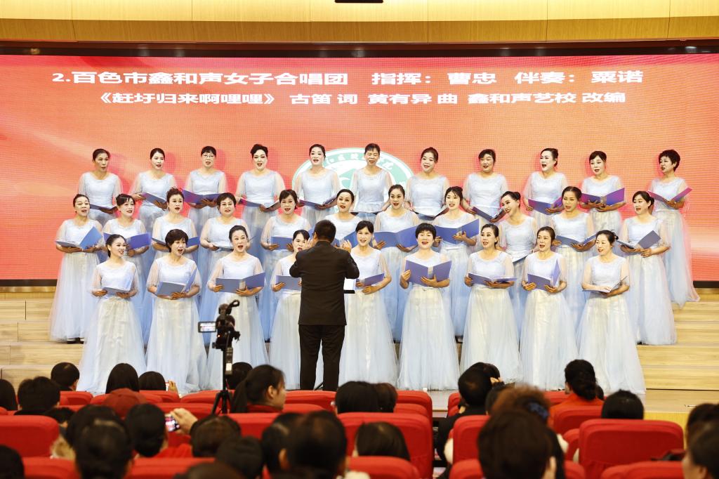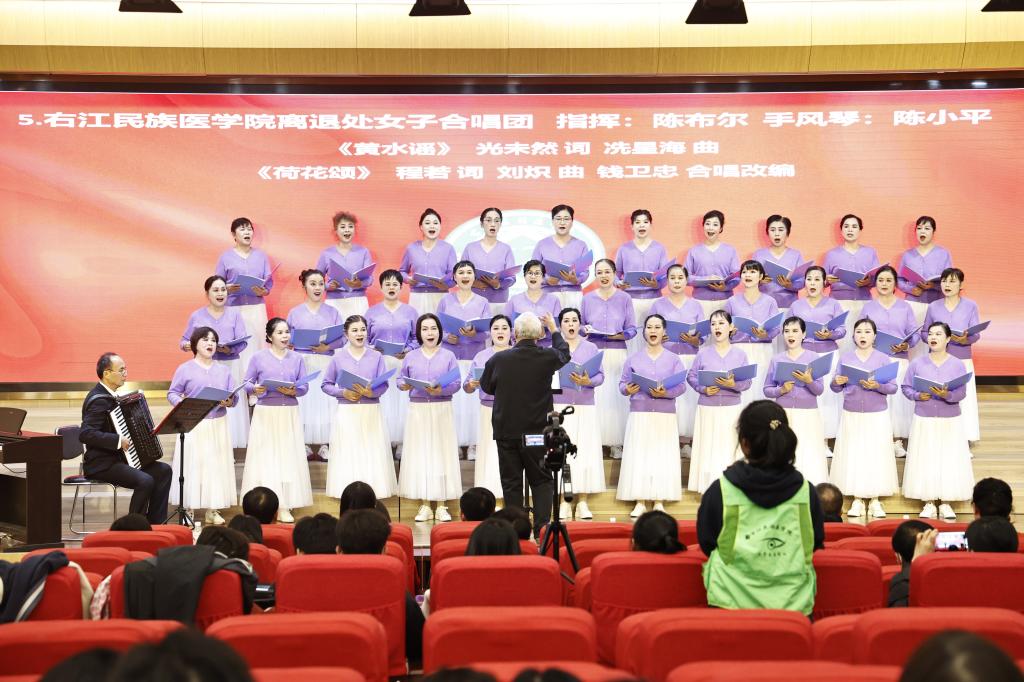 音乐会以开云官网同心合唱团演唱的《追寻》开场,韦鹏涯主任富有感染力的指挥和同学们悠扬婉转的歌声唱响了爱国热情和民族情怀,点燃了现场的气氛。紧接着,由百色市鑫和声田阳合唱团献唱的《赶圩归来阿哩哩》,曲风轻扬,令人感到愉悦;百色市老年大学合唱团、雅乐女子合唱团等极具民族特色的《桃花红杏花白》《去一个美丽的地方》《半个月亮爬上来》《阿拉木汗》混声合唱歌曲在国际会议中心悠悠回荡。在高亢激昂、振奋人心的红色歌曲《再唱东方红》《没有共产党就没有新中国》进行合唱之时,台下观众们慷慨激昂的跟着合唱,大家共同以饱满的热情唱出了对党和祖国的无限热爱,展现了右医师生团结奋进、昂扬向上的精神风貌。