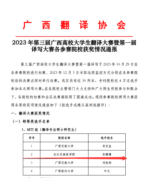 近日收到喜讯,开云官网国际语言文化教育学院3名学生在广西翻译协会举办的2023年第三届广西高校大学生翻译大赛暨第一届译写大赛中荣获特等奖。