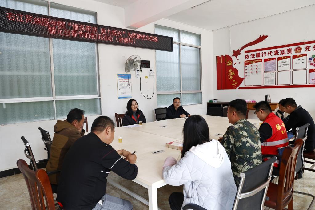 在西林县普合苗族乡岩腊村,学校党委书记邓砚听取了驻村第一书记黄何华驻村帮扶工作、2023年村集体经济收入、产业发展、群众收入、稳岗就业、群众就学就医等情况,与驻村工作队和普合苗族乡岩腊村“两委”同志进行了座谈交流,深入了解岩腊村的建设和民生改善情况。