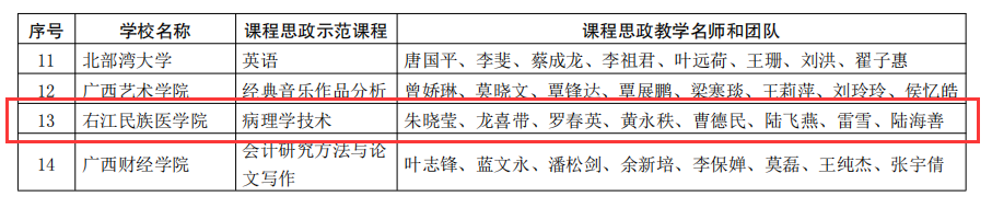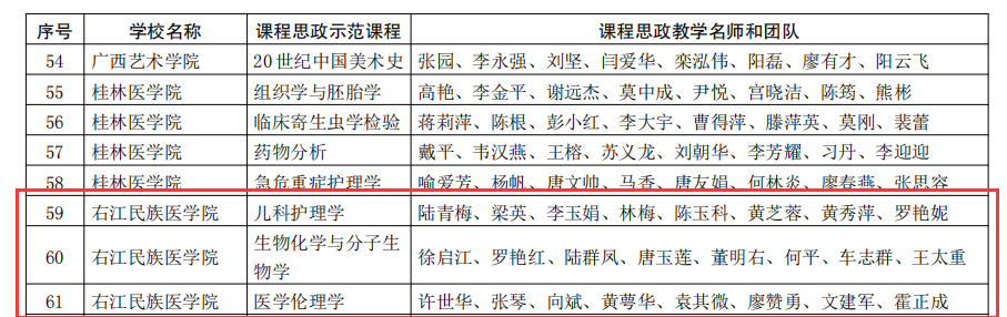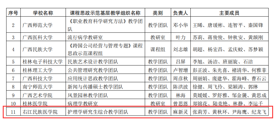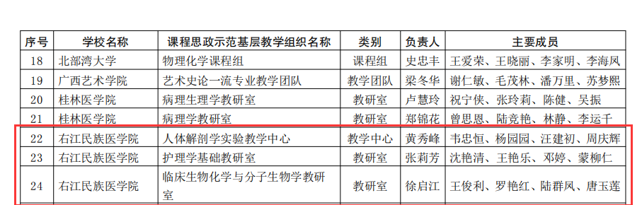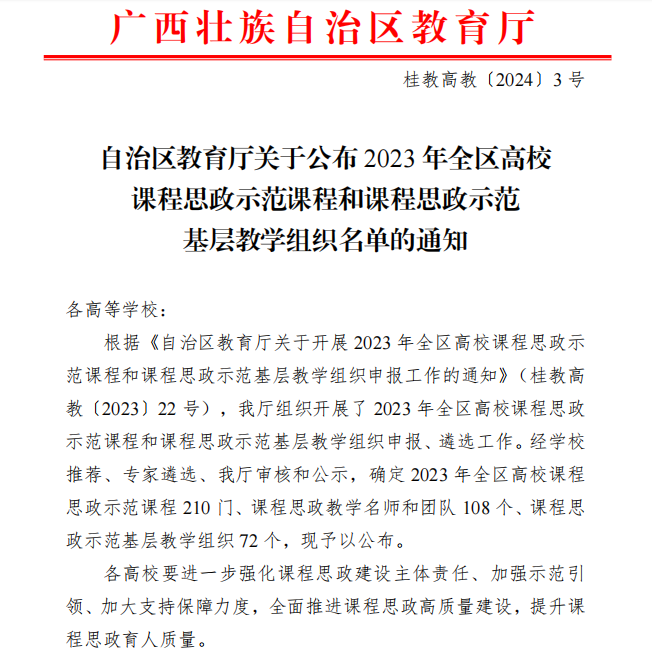 近日,自治区教育厅下发《关于公布2023年全区高校课程思政示范课程和课程思政示范基层教学组织名单的通知》(桂教高教〔2024〕3号),开云官网共有4个基层教学组织获认定为2023年广西高校自治区级课程思政示范基层教学组织、4门课程获认定为自治区级课程思政示范课程,获得课程思政示范课程的相应授课教师和教学团队同时被认定为自治区级课程思政教学名师和教学团队(具体名单见下图)。