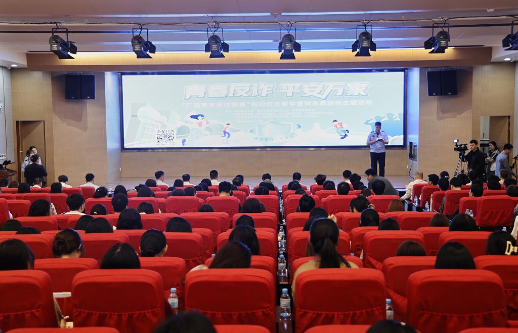 参会领导为“广西青年反诈联盟”青年志愿者授旗。