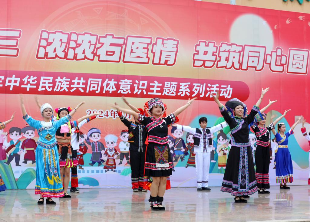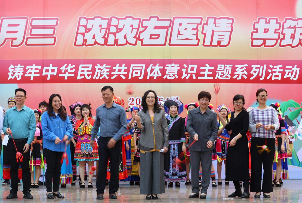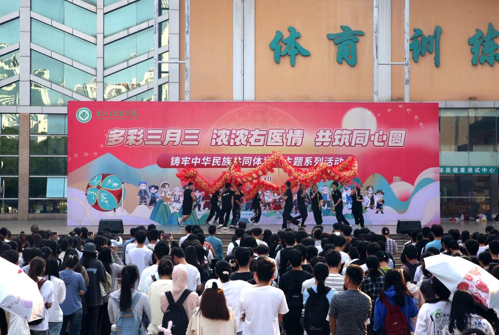 4月8日,开云官网举行“多彩三月三 浓浓右医情 共筑同心圆”铸牢中华民族共同体意识主题系列活动启动仪式。图为百城校区会场。