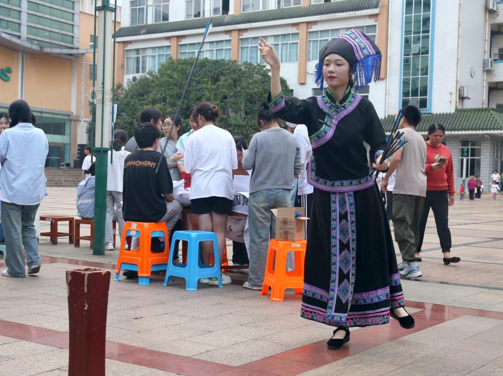 乘三月三之风,扬壮乡之风情。开幕仪式结束后,各二级学院与社团组织开展了竹竿舞、抽陀螺、踩高跷、板鞋竞速等各种富有民族特色的活动。身着各民族特色服装的师生们积极参与活动中,大家在欢声笑语中感受民族风采,现场热闹非凡。校易班总站还为同学们提供了五色糯米饭、艾叶粑粑这类具有民族特色的食物,不仅让同学们在活动中感受民俗文化乐趣,更是从味蕾上感受到了民族文化的独特魅力。