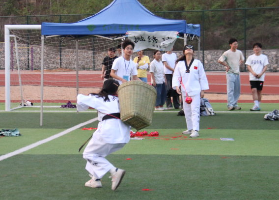 与会领导将手中蕴含着好运的绣球抛向同学们。