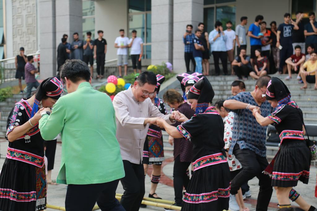 何永军老师在活动中演唱壮族山歌《来百色》,歌声悠扬,旋律优美,让人仿佛置身于壮族村寨,感受到了浓郁的民族风情和壮族文化的独特魅力。施丽英等老师表演了传统壮族舞蹈---扁担舞,舞蹈传播着壮族人民勤劳、质朴的民族精神,展现着壮族人民农耕文化的艺术结晶。国际学生演唱了多首脍炙人口的歌曲,展现了他们多才多艺的一面。