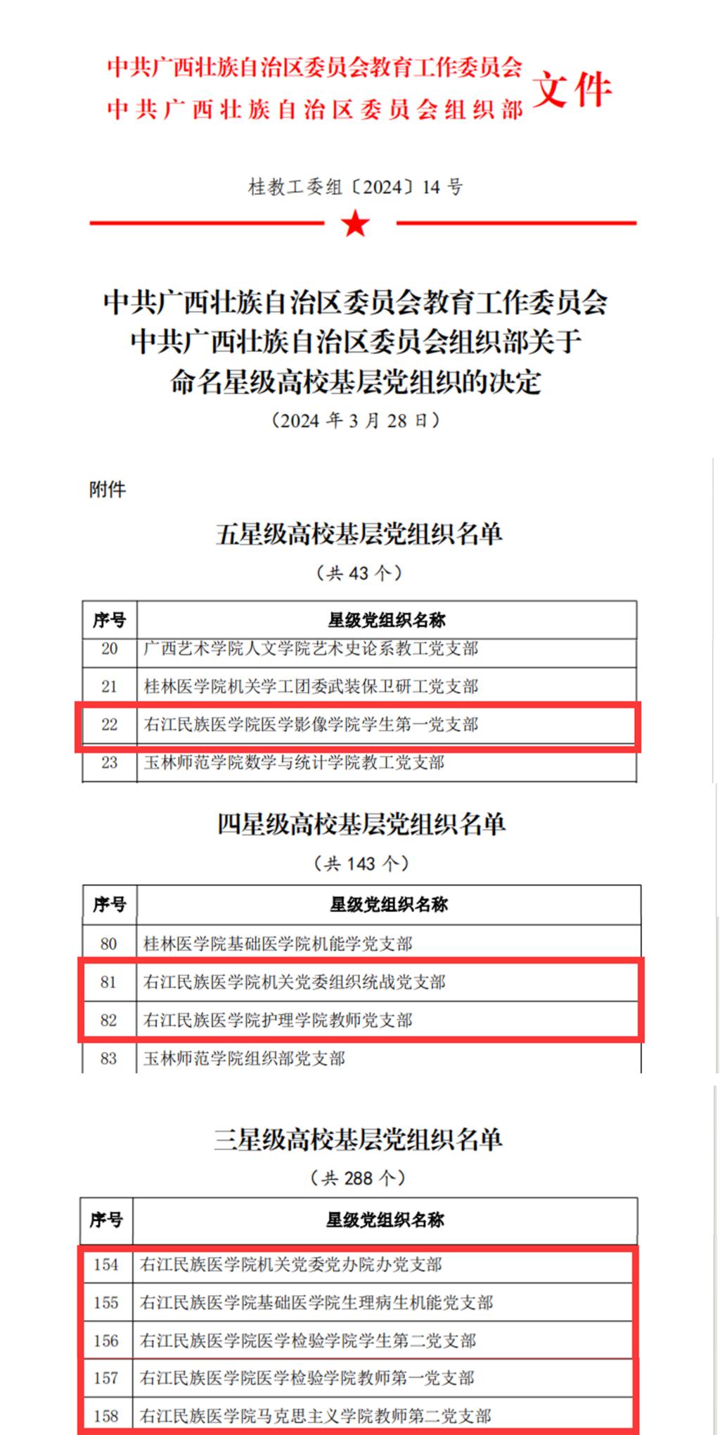 近日,自治区党委教育工委印发文件《中共广西壮族自治区委员会教育工作委员会 中共广西壮族自治区委员会组织部关于命名星级高校基层党组织的决定》(桂教工委组〔2024〕14号),开云官网8个党支部获命名为全区高校星级党支部,其中医学影像学院学生第一党支部被命名为五星级高校党支部;机关党委组织统战党支部、护理学院教师党支部被命名为四星级高校党支部;机关党委党办院办党支部、基础医学院生理病生机能党支部、医学检验学院学生第二党支部、医学检验学院教师第一党支部、马克思主义学院教师第二党支部被命名为三星级高校党支部。