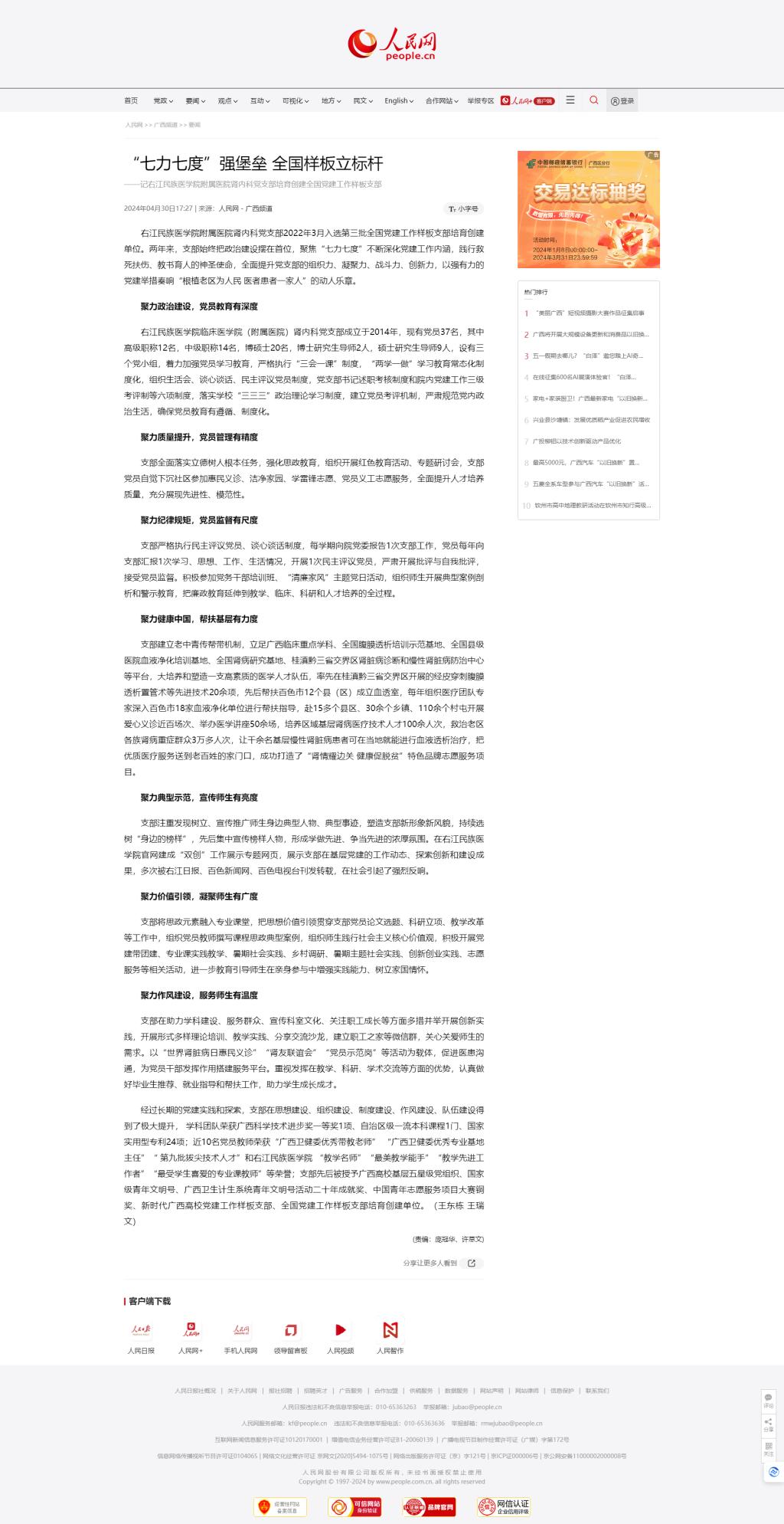 2024年4月30日,人民网刊发报道:“七力七度”强堡垒 全国样板立标杆——记开云kaiyun登录入口附属医院肾内科党支部培育创建全国党建工作样板支部。