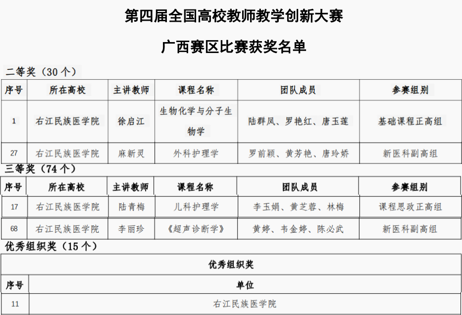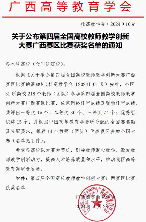 第四届高校教师教学创新大赛广西赛区由自治区教育厅指导、广西高等教育学会主办,广西大学承办。大赛共有218个教师(团队)入围。经过网络评审,119个教师(团队)晋级决赛。最终产生一等奖15项、二等奖30项、三等奖74项。