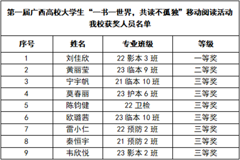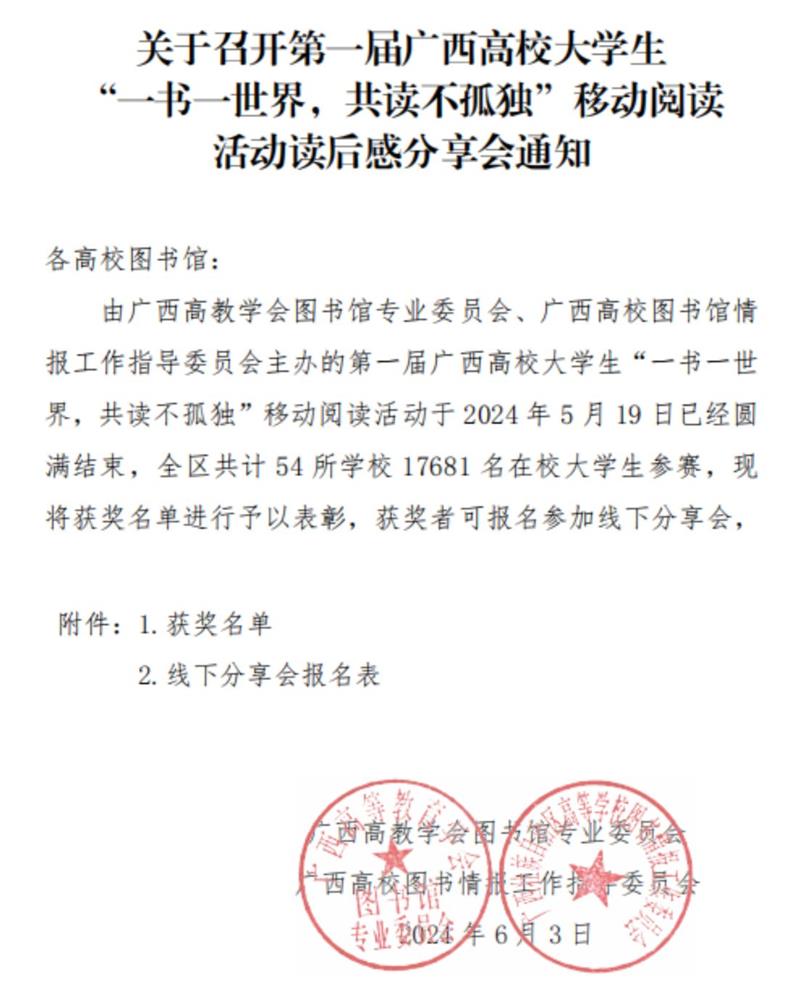 由广西高教学会图书馆专业委员会、广西高校图书情报工作指导委员会主办的第一届广西高校大学生“一书一世界,共读不孤独”移动阅读活动于2024年5月19日已经圆满结束,本次比赛旨在帮助大学生养成良好的阅读习惯,让学习成为一种信仰,营造“爱读书、读好书、善读书”的校园文化氛围。