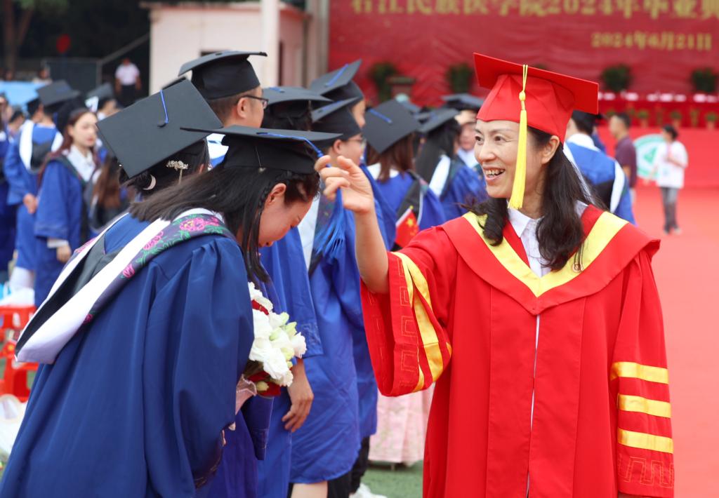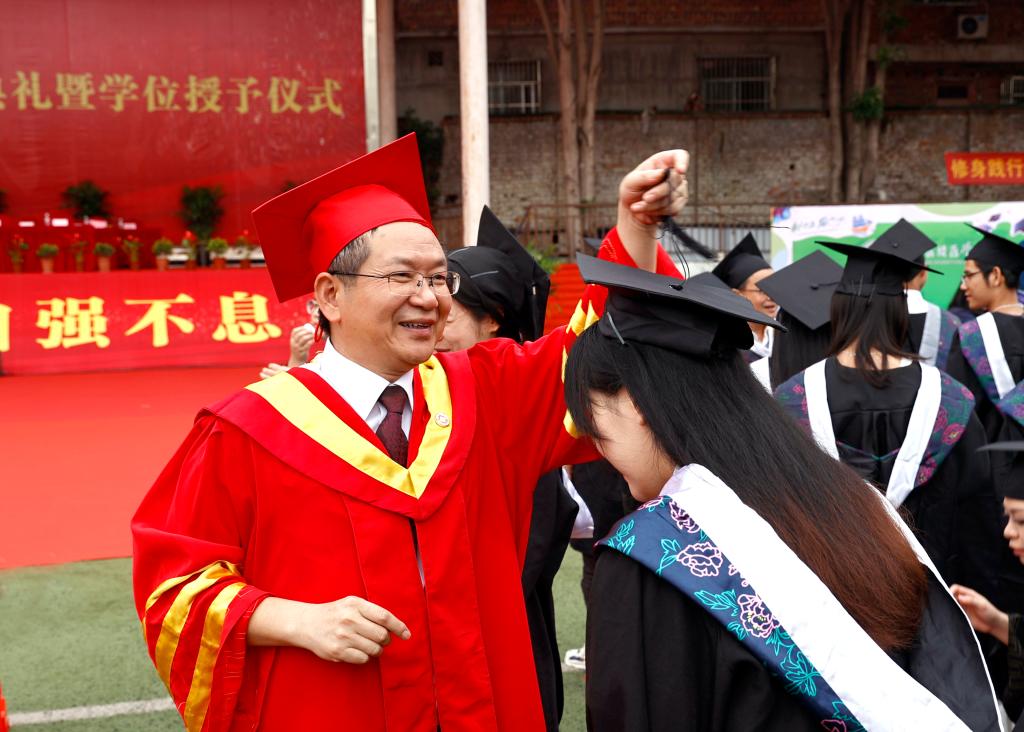 在典礼上,党委常委、副校长周艳娥宣读《表彰优秀毕业生的决定》文件,与会领导为优秀毕业生代表颁奖。党委常委、副校长黄龙坚宣读《关于授予毕业生学士学位和硕士学位的决定》文件,学校领导、各二级学院领导为全体获得学位的毕业生扶正流苏并合影留念。