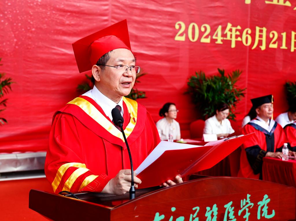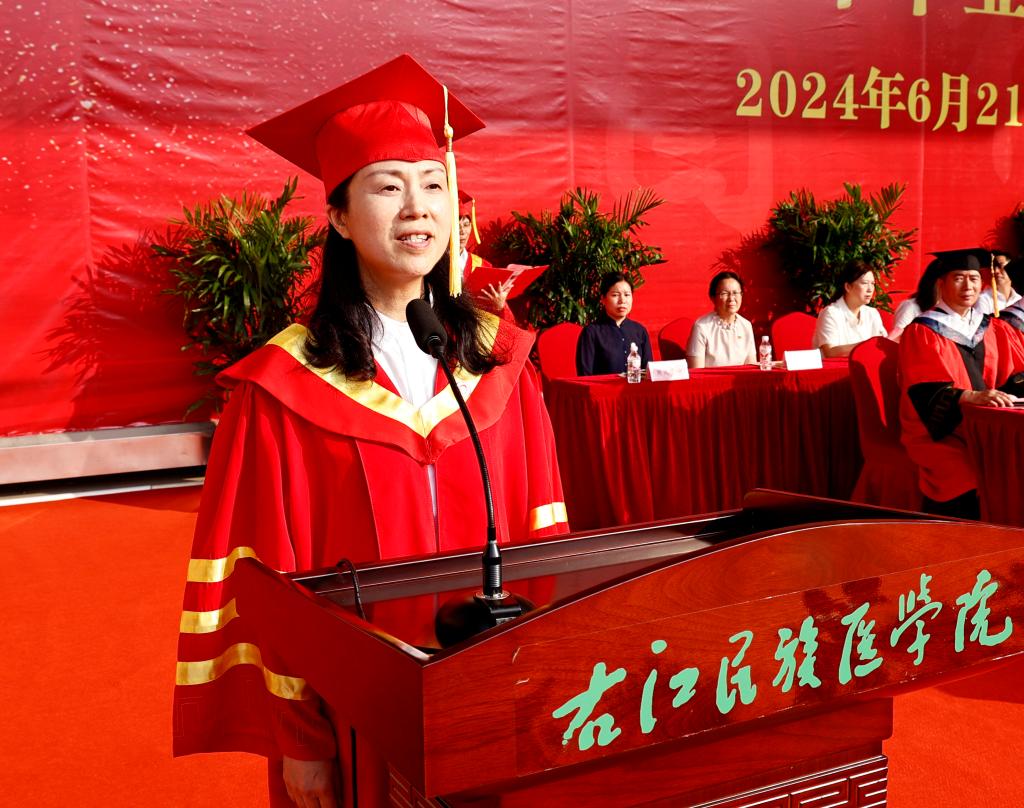 学校党委副书记、校长李雪斌发表了热情洋溢的讲话,他以《以“热辣”青春追逐“滚烫”梦想》为主题,回顾了同学们在学校学习生活期间的历程,对同学们的美好未来寄予了殷切希望。他寄语同学们,要不坠青云之志,争当“挺膺担当、堪当重任”的时代新人,扎根祖国大地,下得去、用得上、留得住,弘扬“艰苦创业,自强不息”的右医精神,与祖国同心、与时代同向、与人民同行,做铸牢中华民族共同体意识的传播者、实践者、推动者,成为能堪当民族复兴重任的时代新人;要把握医学温度,争当“精于医术、诚于人品”的人间大医,时刻牢记医学的初心使命,守医德、正医风、弘医道,护佑生命、救死扶伤、甘于奉献、大爱无疆,让医学人文之花美丽绽放;要秉持崇德向善,争当“积极乐观、向阳而生”的追光之人,无论在顺境还是逆境中都能保持自己的本色,坚定“把每一项平凡工作做好就是不平凡”的恒心,保持“把每一件小事情做好就是大事业”的匠心,逆风飞翔、向阳而生。他还希望同学们,无论身居何方,都要记得自己的根与魂,记得人民的重托、母校的期待,不抛弃、不放弃、“总要赢一次”,以“热辣”的青春去追逐“滚烫”的梦想。