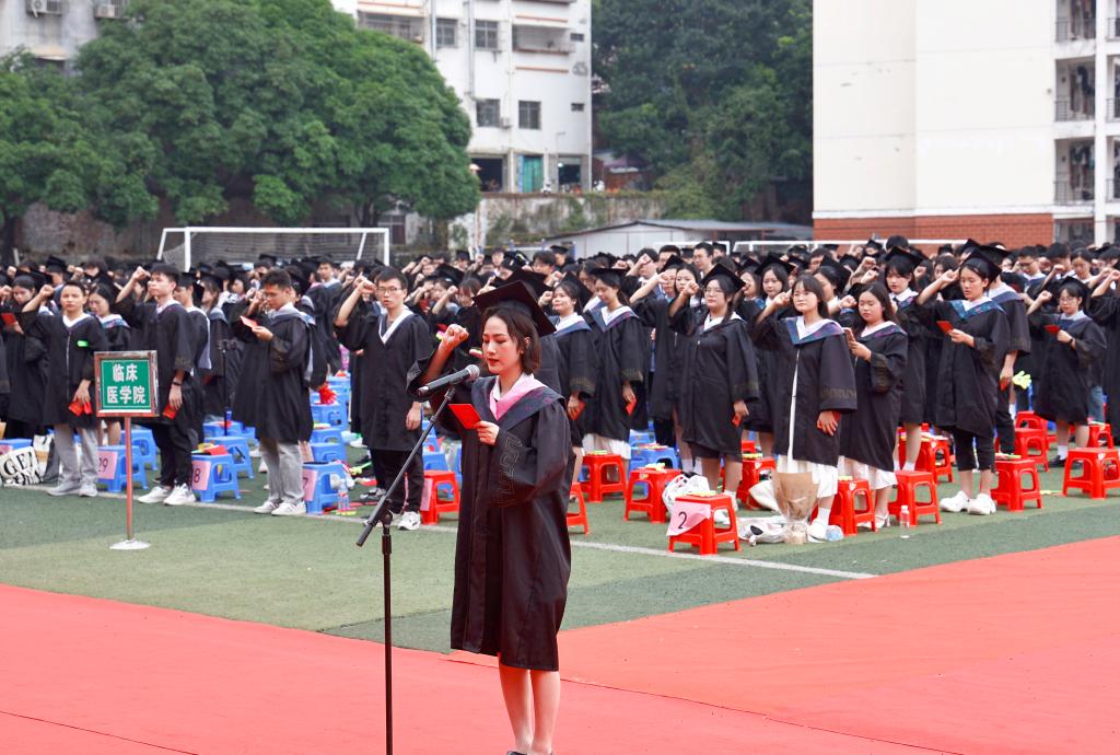 本科生代表张林莉在毕业典礼上表示,“艰苦创业、自强不息”的精神锤炼了右医学子的思想,“大医精诚”的校训铸牢了右医学子对医学的信仰,感谢母校让我们有能力站在更高的舞台上继续成长;感谢老师让我们向成长一名优秀的临床医生愈加靠近;感谢同学们彼此能够在筑梦未来的路上并肩前行。我们即将踏上新的征程,相信我们每一个人都能在自己的学业和岗位上做出一番成绩,展示右医学子的独特风采。