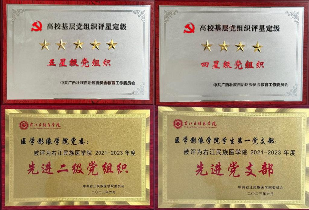 大力实施“强基工程”,促进组织设置优化,夯实党建根基,激发党支部工作活力。将教师党支部建在教研室上,为党建与业务融合提供基础保障。定期举办支部书记培训班,开展典型交流、述职考核,以点带面推动支部建设全面过硬。学生第一党支部“三微践初心榜样做领航——微志愿”品牌项目获首批广西高校党建创新典型案例。学生第一党支部顺利通过自治区首批新时代党建工作样板支部验收,完成全国第三批党建工作板支部培育建设任务。学院党委现有五星级党支部1个,四星级党支部1个,三星级党支部2个。近三年,10名党员教师荣获学校“优秀共产党员”和“优秀党务工作者”称号。实施党支部书记“双带头人”培育工程,“双带头人”比例达100%。把教师党支部建成立德树人的阵地、团结师生的核心、攻坚克难的堡垒,使广大党员教师成为“四有”好老师的表率健全储备机制。注重从政治素质好的骨干教师中发展党员,选拔热爱党务工作、教学科研能力突出的青年教师党员担任党支部委员,加强培养历练,确保后备有人。促进党建业务同频共振,提升党支部战斗作用。以教师党员和业务骨干为主力,成立课程建设团队、课程思政团队、教育教学团队、学科竞赛指导团队、学生考研指导团队、科技创新团队等,结合学院“十四五”规划,明确团队的工作目标与任务,科学评价团队工作业绩,表彰激励优秀团队,充分发挥专业团队在党建与业务融合中的重要作用。四门专业核心课程均获第二批校级课程思政示范项目;超声医学教研室获批校级课程思政示范基层教学组织。教师获“人卫杯”全国医学影像专业青年教师教学基本功竞赛奖、广西高校教育教学信息化大赛奖、全国高校教师教学创新大赛广西赛区奖、广西医学会影像技术学分会微课比赛奖等42项,其中省级二等奖2项,三等奖1项。