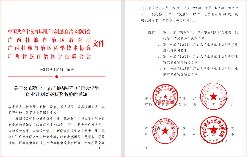 近日,由共青团广西区委、自治区教育厅、自治区科协、广西学联共同主办的第十一届“挑战杯”广西大学生创业计划竞赛落下帷幕。开云官网推报的30项作品中,有23项获奖,其中,荣获自治区金奖2项,银奖3项,铜奖18项,获奖数量创历史新高。