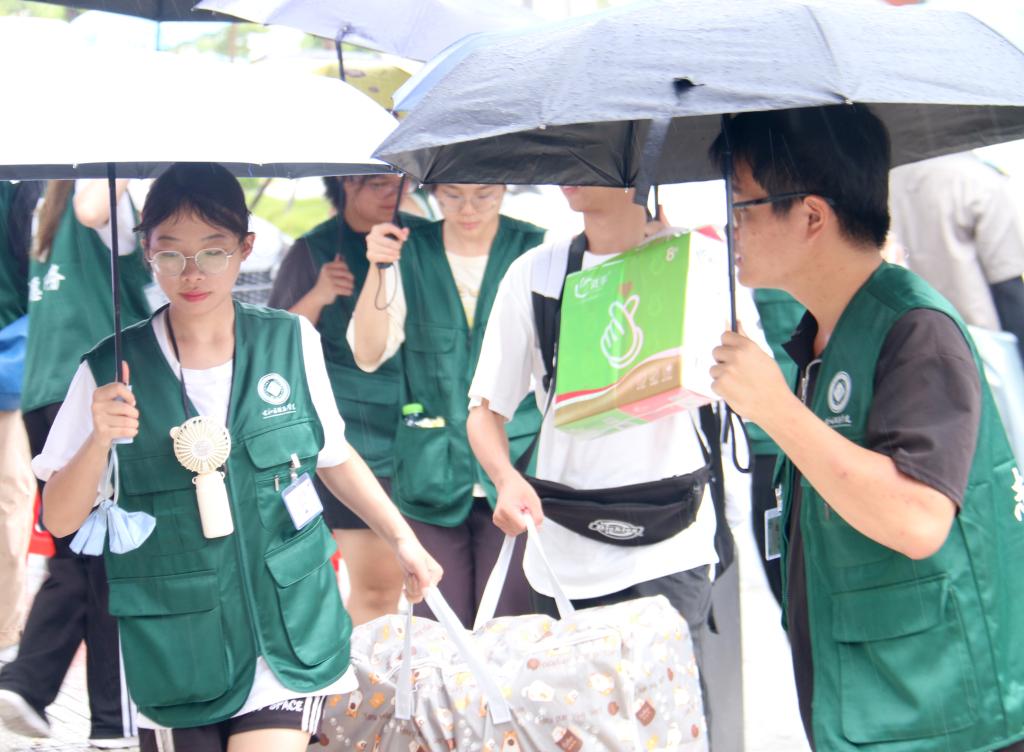 在校园各处,身着右医绿马甲的志愿者也是随处可见,他们如同雨中的精灵,撑着雨伞或穿着雨衣穿梭在人群中,为新生及家长提供行李搬运、路线指引等贴心服务,成为了校园里一道亮丽的风景线。