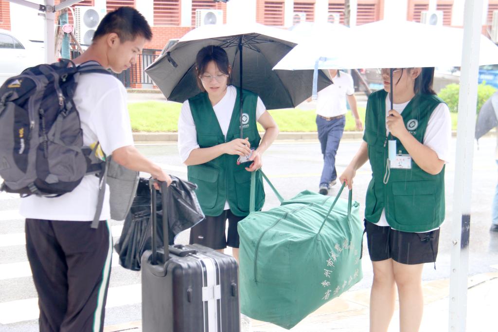 “新同学你是哪个宿舍的?”“跟我来!我们帮你把行李送到宿舍。”来来往往的志愿者顾不上被雨水浸湿的衣衫,耐心地为新同学们解答问题,带他们去往各个教室和宿舍。