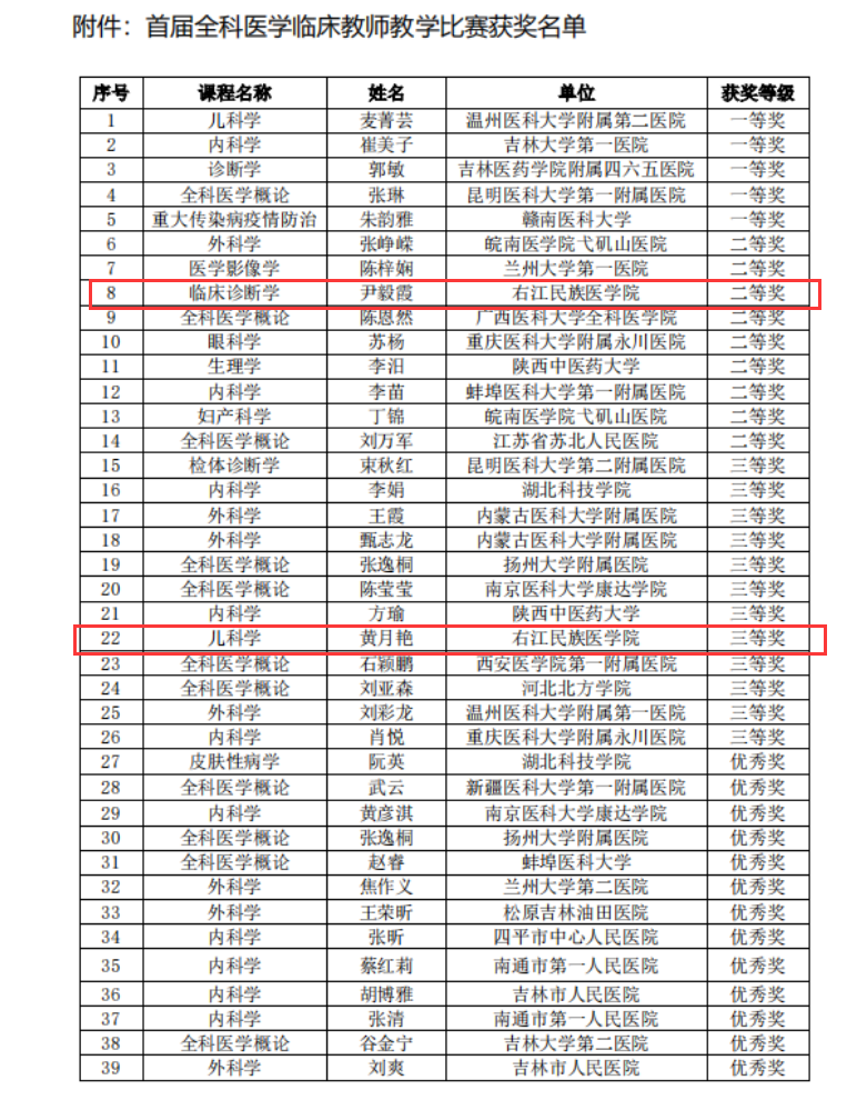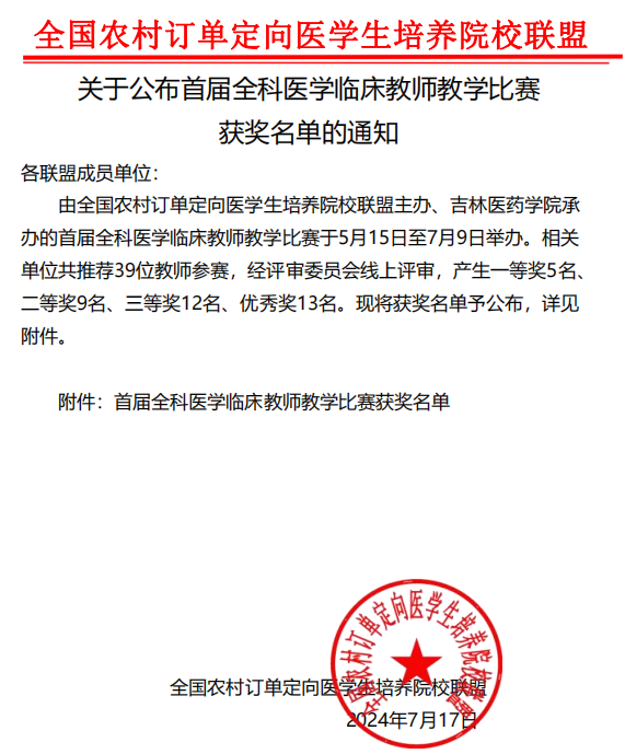 近日,全国农村订单定向医学生培养院校联盟公布首届全科医学临床教师教学比赛获奖名单。开云官网尹毅霞教授荣获二等奖、黄月艳教授荣获三等奖。