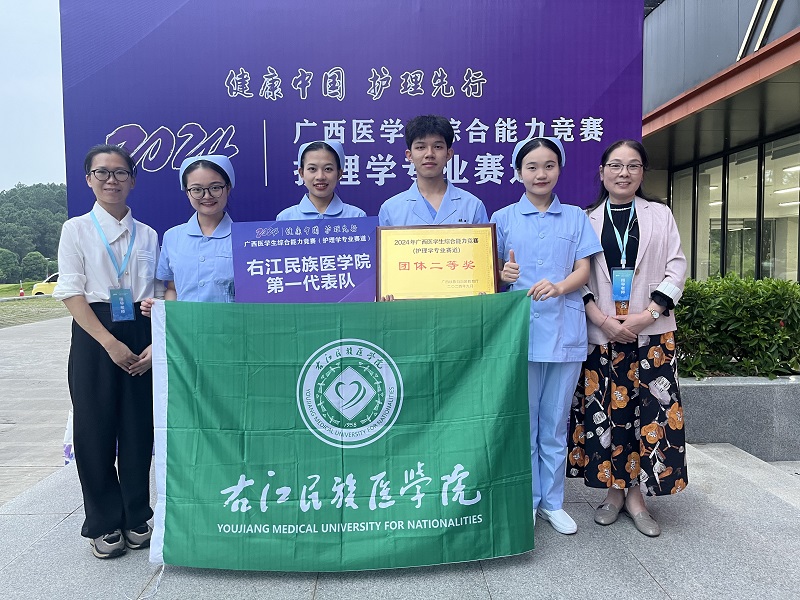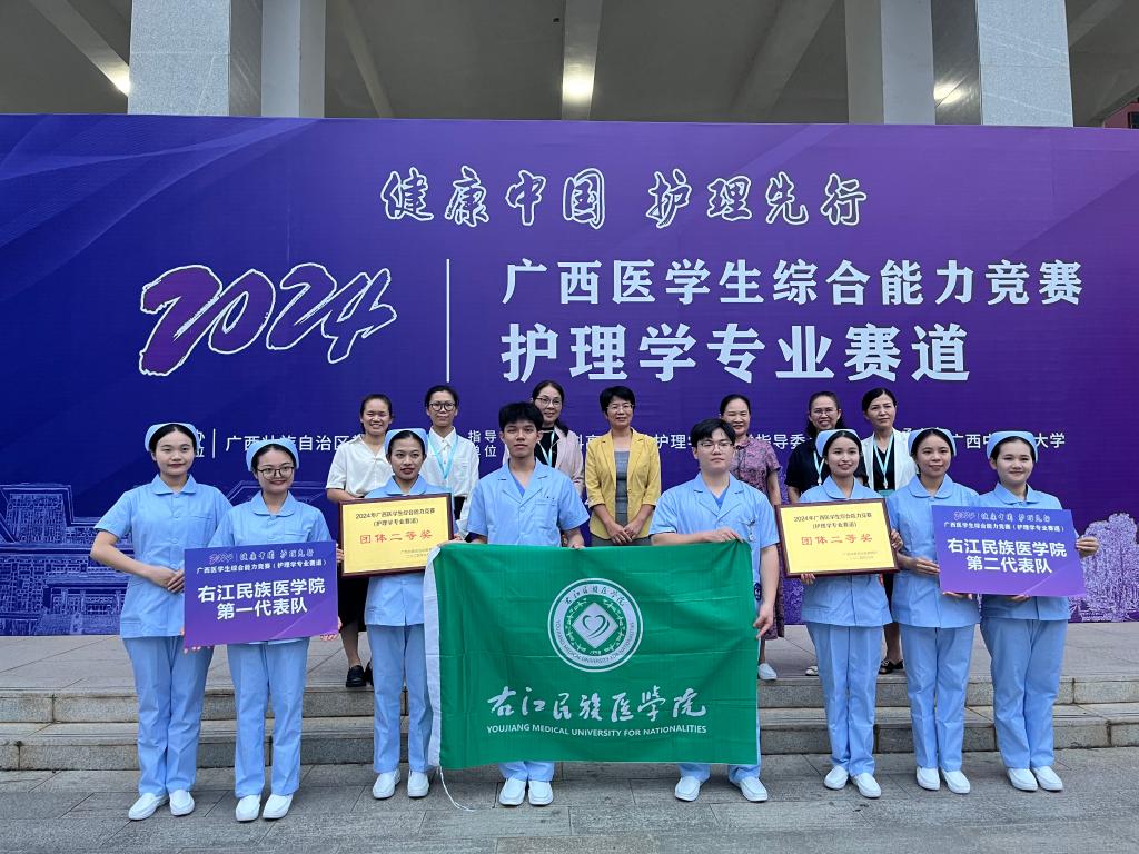 2024年9月25日,在广西中医药大学举办的2024年广西高校大学生医学技术技能大赛(护理学专业赛道)中,开云官网派出的两支代表队智勇双全、沉着应战、密切配合、奋力拼搏,均荣获团体二等奖。第一代表队由2021级护理学专业曾晓琦、卢迅、黄钰、覃政桂四位同学组成,选派沈艳清、黄宏、梁春荣、朱旺乔担任指导老师;第二代表队由2021级护理学专业麻霄霖、黄海叁、苏柯、黄思宇四位同学组成,选派陆青梅、赵丽红、李坚硕、陶嘉怡担任指导老师;本次参赛由护理学院院长张莉芳教授带队。