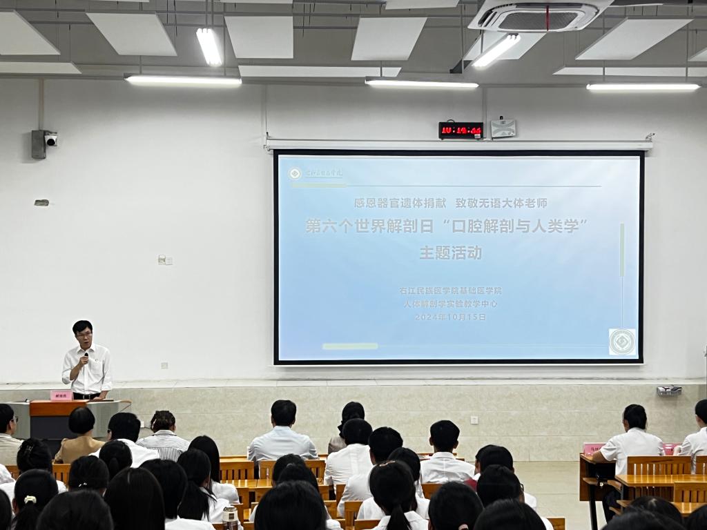 10月15日上午,开云官网联合百色市红十字会举办“感恩器官遗体捐献,致敬无语大体老师,第六个世界解剖日‘口腔解剖与人类学’主题活动”。学校党委常委、副校长解继胜,百色市红十字会党组成员、秘书长马桂荣,副会长陆彬出席活动,学校教务处、教育评价与教师发展中心、基础医学院、人体解剖学实验教学中心和教研室相关负责人及部分教师,百色市“三献”志愿服务队相关负责人,2024级临本9班、10班全体同学参加活动,共同缅怀为医学事业做出无私奉献的“无言良师”。