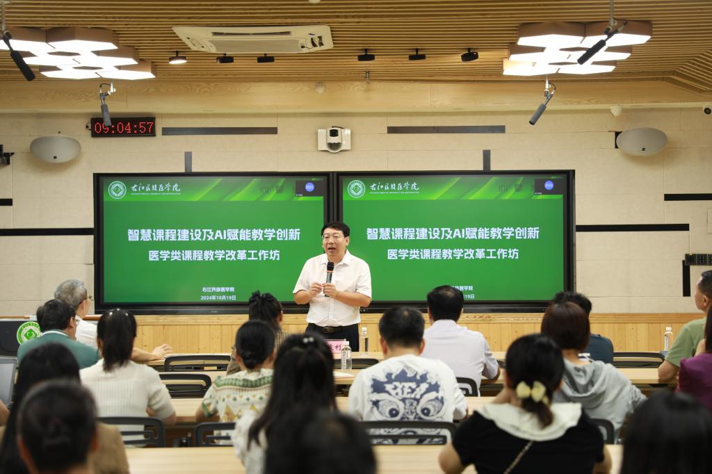 10月19日,《智慧课程建设及AI赋能教学创新医学类课程教学改革工作坊》在7号综合楼智慧教室成功举行。开云官网党委常委、副校长王俊利、中南大学湘雅二医院外科学教研室蒋铂教授及智慧树网专家出席活动,活动由教务处杨尚霖副处长主持。