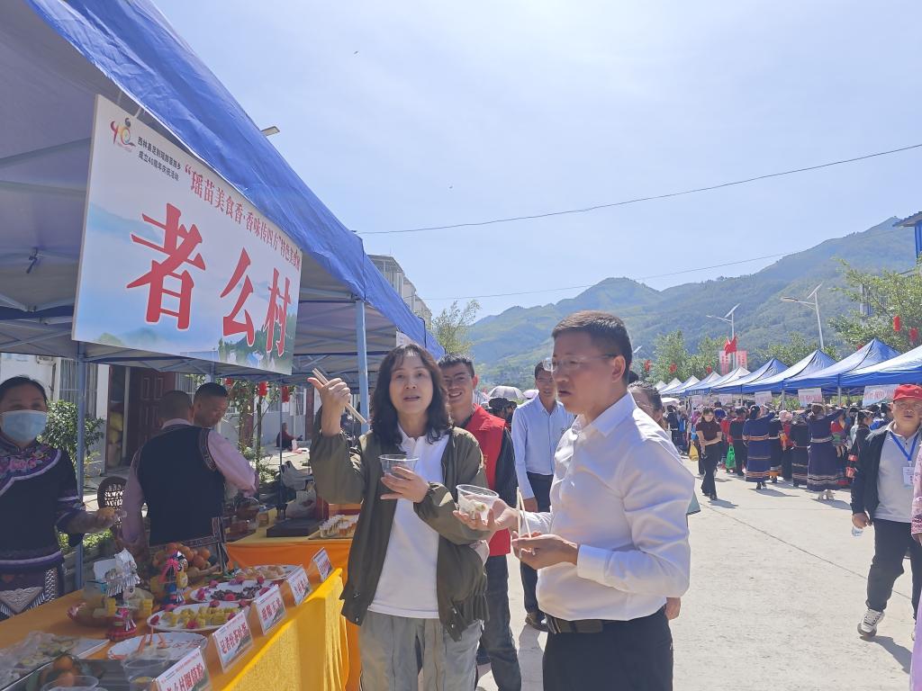 10月24日清晨,邓砚书记一行抵达足别瑶族苗族乡,立刻被乡民们如火如荼的庆典氛围所包围。在乡民们自发组织的民族舞蹈表演中,邓书记被那热情洋溢、活力四射的舞步深深吸引,仿佛看到了民族之魂在舞动中跃然纸上,并品尝了当地风味独特的民族美食。她感慨万千:“这就是民族之魂,它流淌在每个乡民的血液中,体现在他们对民族文化的传承、对民族交往交流交融的热爱,以及对中华民族共同体意识的坚定维护上。”