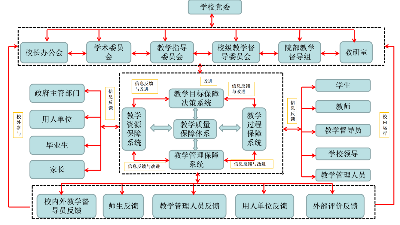 2024年结合本科教育教学审核评估工作要求,根据社会需求、学校办学定位和学生发展实际情况,以“OBE”理念为指导,将学校质量保障体系升级完善为“一套体系、双方参与、三级管理、四套系统、五方反馈”。升级完善的“12345”教学质量保障体系,从“教学质量目标保障、教学资源保障、教学过程保障、教学管理保障”4个方面,明确了各部门和单位的教学质量主体责任,成为保障教学质量持续提升的主体职责明确、相互协调、相互促进的教学质量管理的有机整体。学校通过强化质量保障体系的顶层设计,规范质量标准,强化质保机制,注重质量持续改进,营造了“自觉、自省、自律、自查、自纠”的学校质量文化氛围,着力提升本科教育教学的质量保障能力。