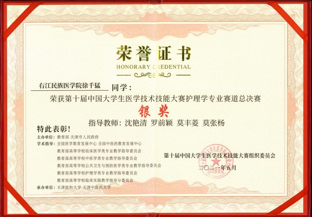 推动实践教学改革,促进理论与实践贯通。围绕岗位胜任力需求加大对实验课程内容进行调整和整合,推动多学科教材融合、综合性实验课程开设以及临床实践教学同质化实施,强化学生实践能力、创新能力培养;以赛促学,开展大学生医学技术技能大赛、基础医学实验技能大赛、医学检验技能大赛、口腔技能展示大赛等实践性竞赛,提升学生的实践应用能力。近三年来,学生获得各类技能竞赛奖项40多项,其中荣获第十届中国大学生医学技术技能大赛护理学专业赛道全国总决赛银奖,临床医学专业赛道华南赛区三等奖,预防医学专业赛道华中华南分区赛三等奖,广西医学生综合能力竞赛特等奖、一等奖各1项,二等奖2项,全国医学检验技术专业大学生在线形态大赛获一等奖1项,二等奖3项。