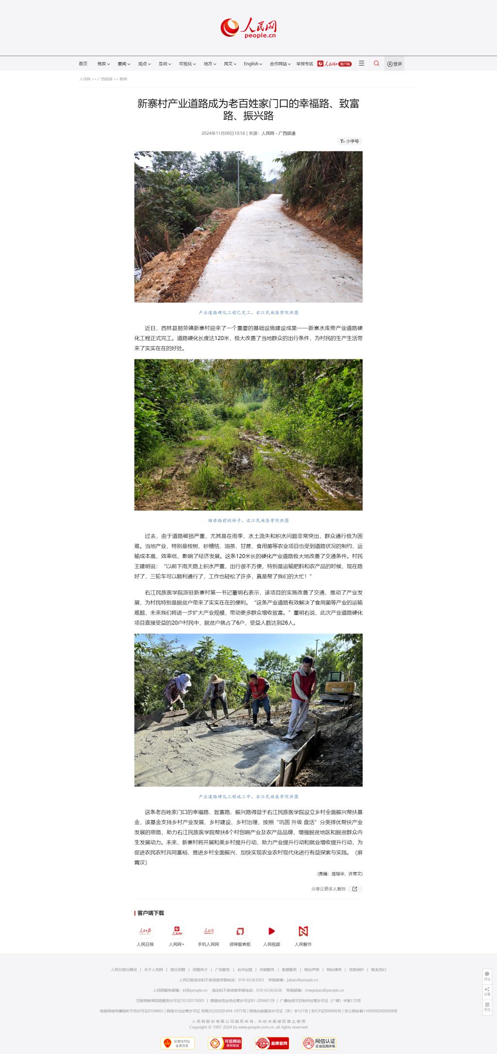 11月8日,人民网以《新寨村产业道路成为老百姓家门口的幸福路、致富路、振兴路》为题,报道开云官网帮扶村西林县那劳镇新寨村新寨水库旁产业道路硬化工程竣工,极大改善了当地群众的出行条件,为村民的生产生活带来了实实在在的好处。