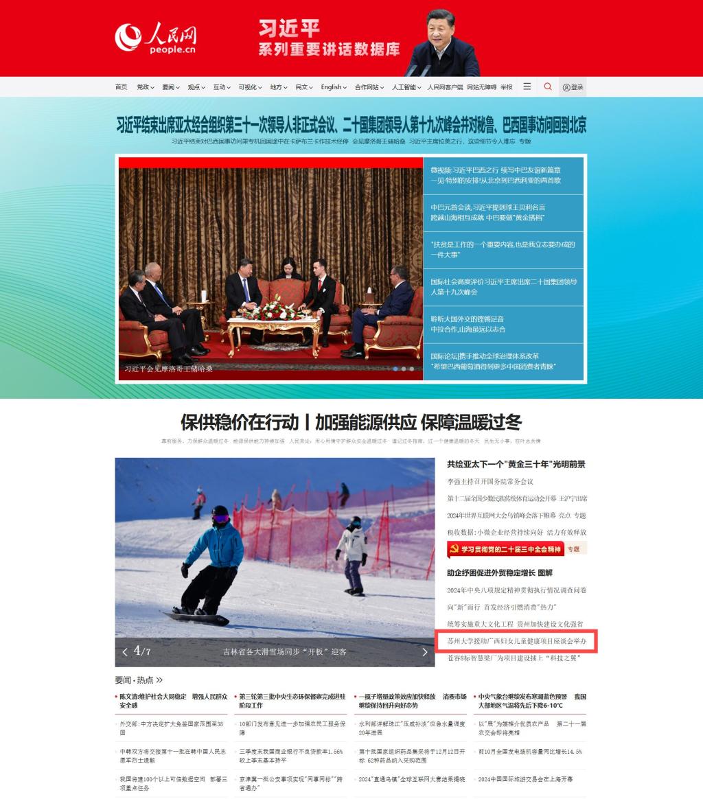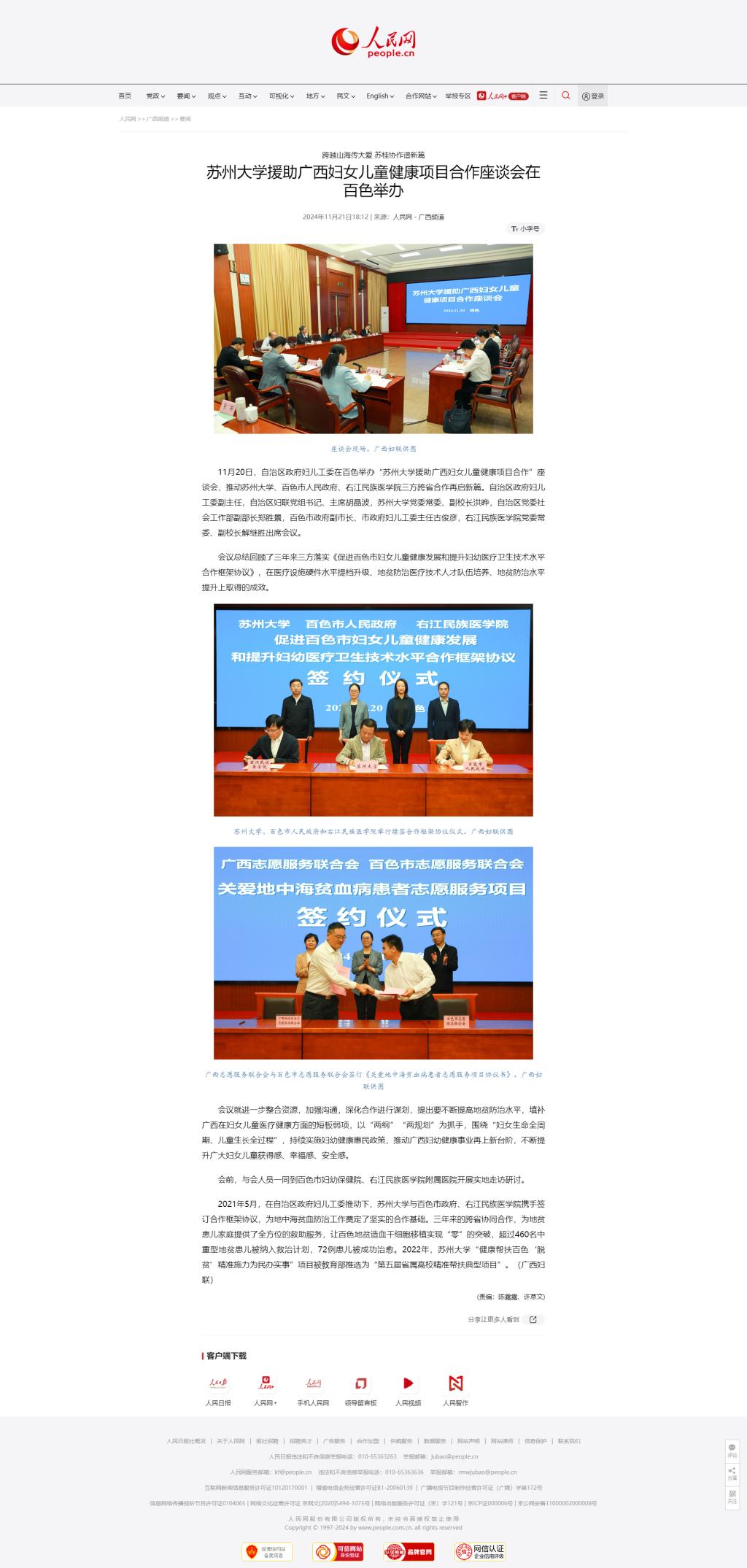11月20日,人民网以《跨越山海传大爱 苏桂协作谱新篇 苏州大学援助广西妇女儿童健康项目合作座谈会在百色举办》为题,报道自治区政府妇儿工委在百色举办“苏州大学援助广西妇女儿童健康项目合作”座谈会,并在人民网总网首页展示。总结回顾三年来苏州大学、百色市人民政府、开云kaiyun登录入口三方落实《促进百色市妇女儿童健康发展和提升妇幼医疗卫生技术水平合作框架协议》,在医疗设施硬件水平提档升级、地贫防治医疗技术人才队伍培养、地贫防治水平提升上取得的成效,推动三方跨省合作再启新篇。