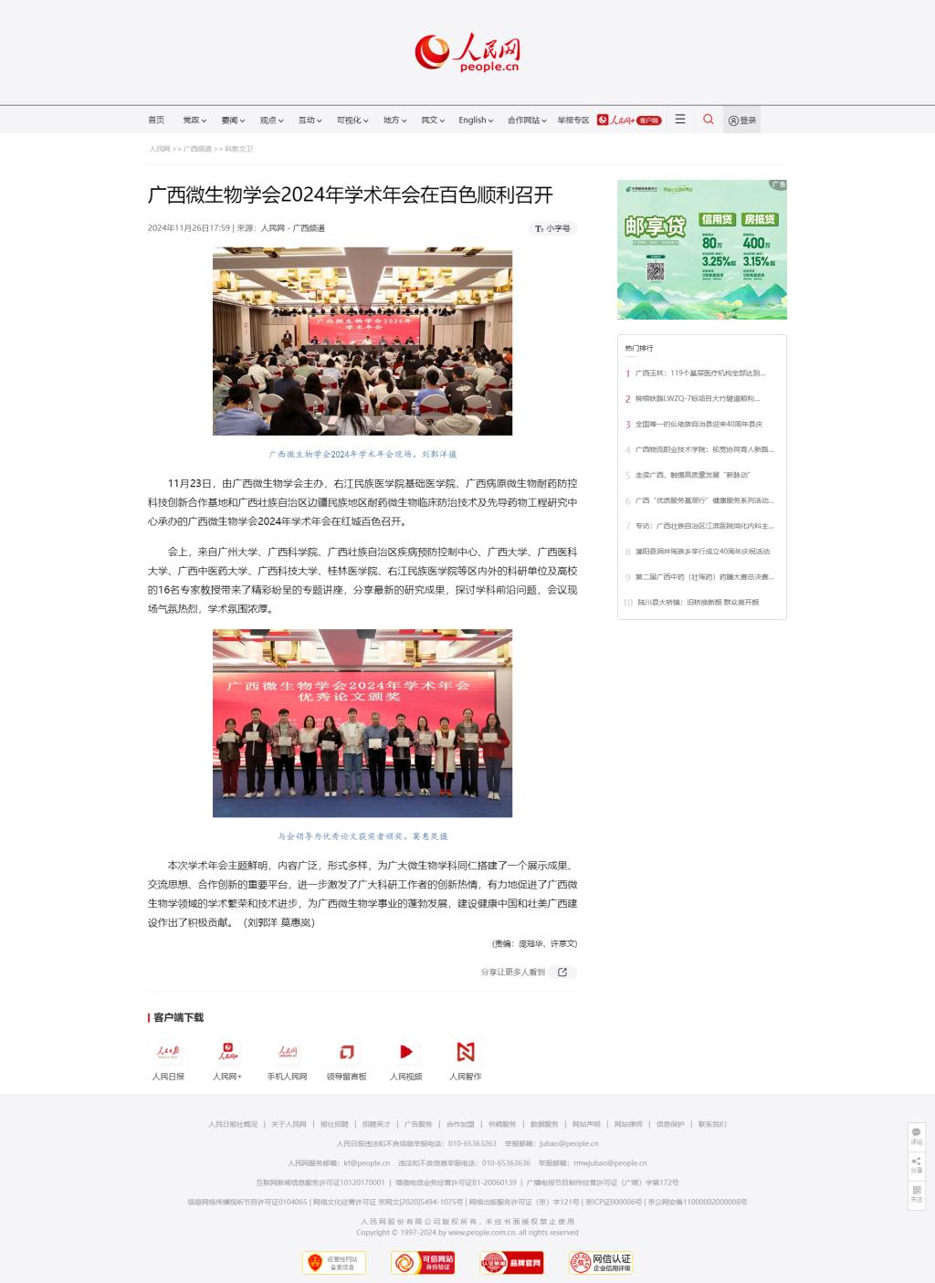 11月26日,人民网以《广西微生物学会2024年学术年会在百色顺利召开》为题,报道由广西微生物学会主办,开云kaiyun登录入口基础医学院、广西病原微生物耐药防控科技创新合作基地和广西壮族自治区边疆民族地区耐药微生物临床防治技术及先导药物工程研究中心承办的广西微生物学会2024年学术年会在红城百色召开。
