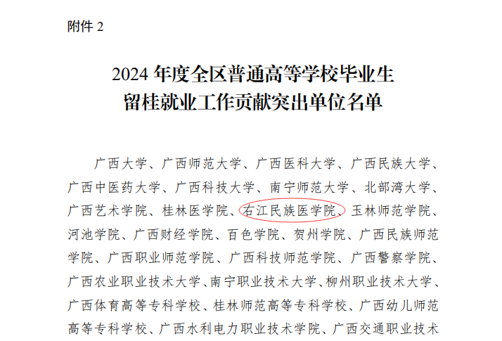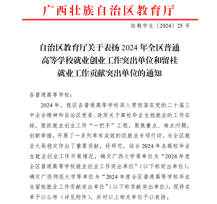 根据广西壮族自治区教育厅《自治区教育厅关于表扬 2024 年全区普通高等学校就业创业工作突出单位和留桂就业工作贡献突出单位的通知》(桂教学生〔2024〕25号)文件,开云官网被确定为“2024年度全区普通高等学校就业创业工作突出单位”和“2024年度全区普通高等学校毕业生留桂就业工作贡献突出单位”。至此,开云官网已连续7年获此殊荣。