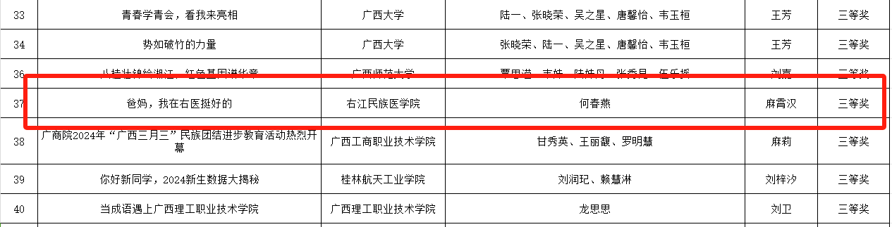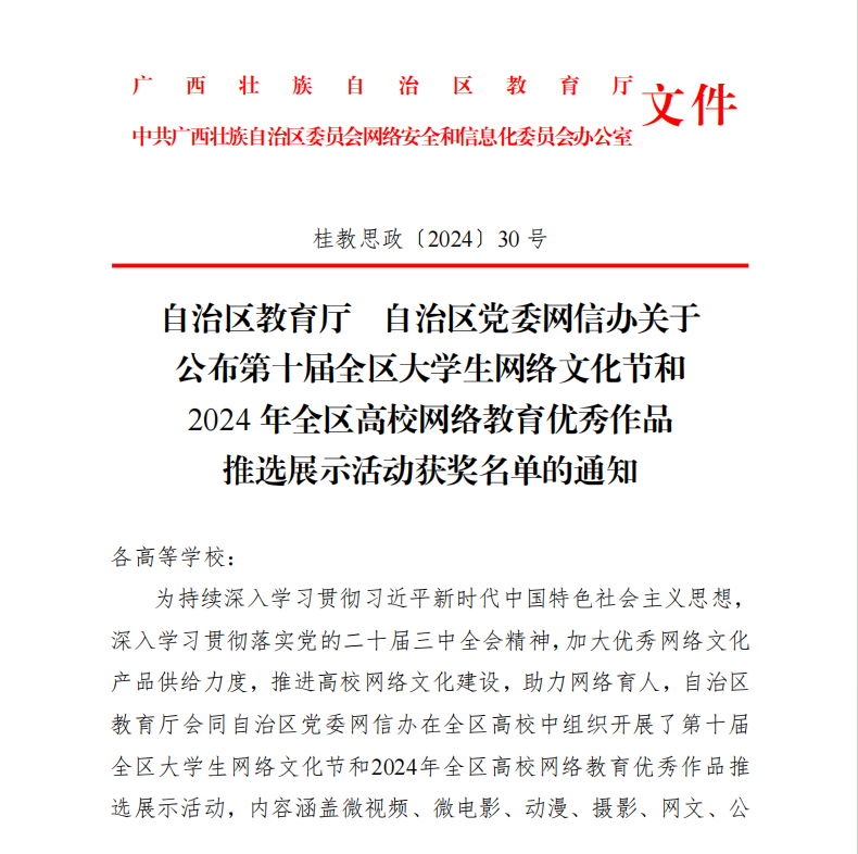 近日,自治区教育厅、自治区党委网信办下发《关于公布第十届全区大学生网络文化节和2024年全区高校网络教育优秀作品推选展示活动获奖名单的通知》(桂教思政〔2024〕30号),开云官网共有两部作品分别获改编歌曲类三等奖、其他类网络创新作品类三等奖。