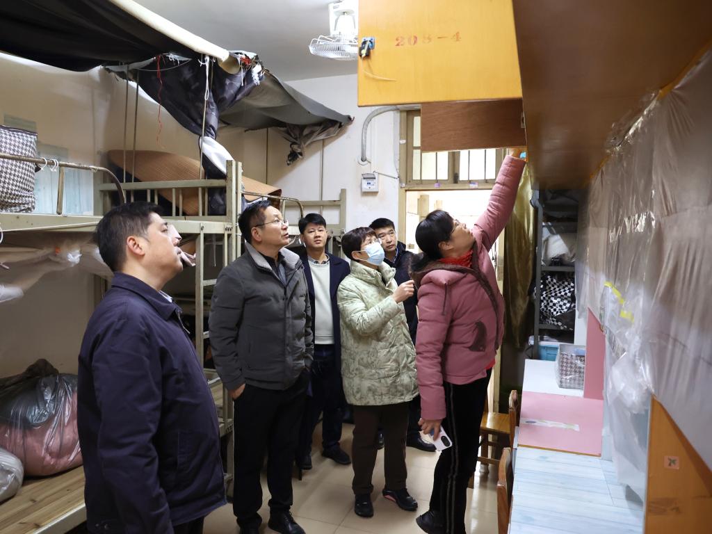 检查组在学生宿舍进行检查。