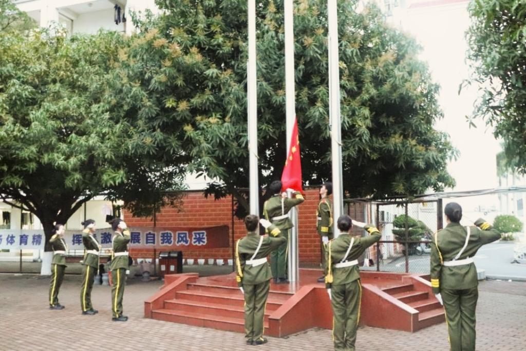 伴随着激昂的国歌响起,全体师生庄严肃立,向鲜艳的五星红旗行注目礼并唱国歌。在雄壮的国歌声中,五星红旗缓缓升起,迎风飘扬,象征着新学期新气象的开始。