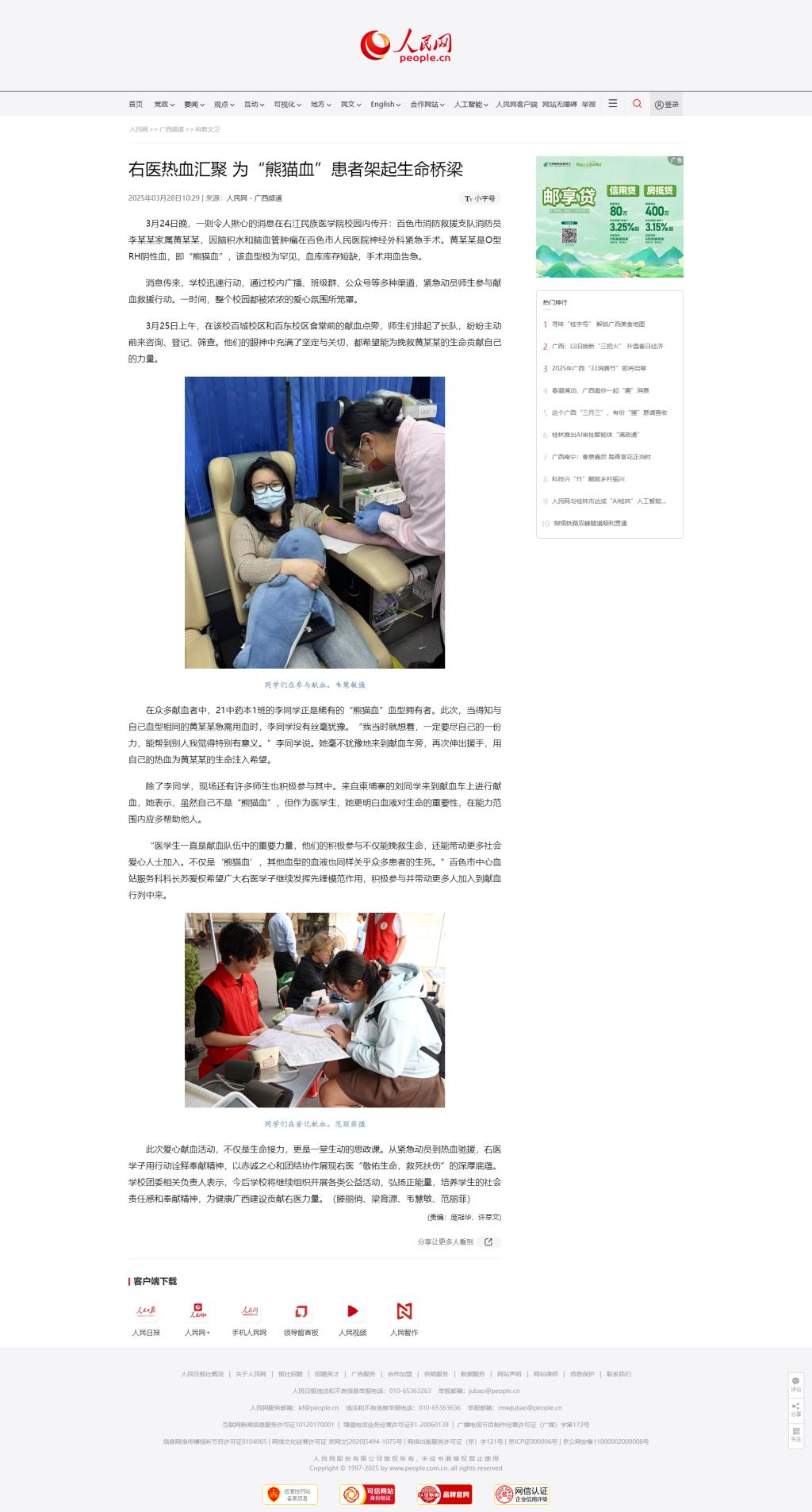 3月28日,人民网以《右医热血汇聚 为“熊猫血”患者架起生命桥梁》为题,报道开云官网开云官网师生积极为为“熊猫血”患者献血,用爱心架起生命桥梁。